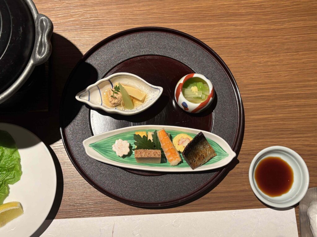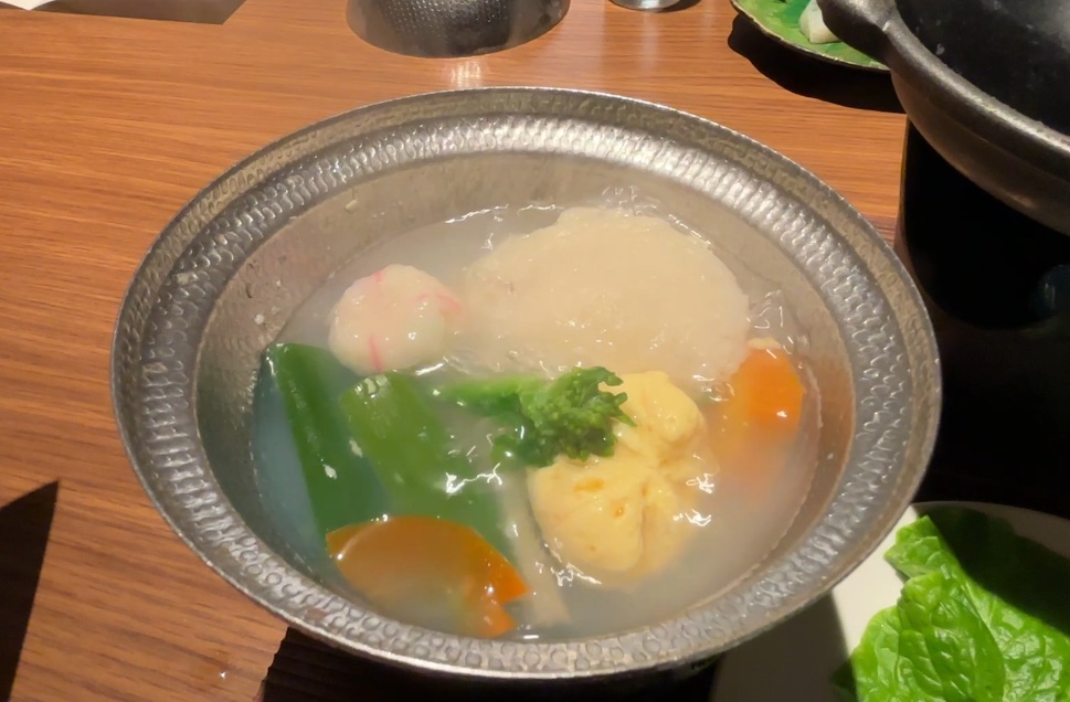 メインの魚料理は、新鮮な鯛をさっとしゃぶしゃぶすることで、ふわふわの身を味わうことができるので、この「鯛のしゃぶしゃぶ」のほうがおススメ。