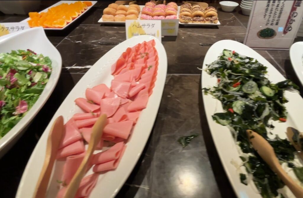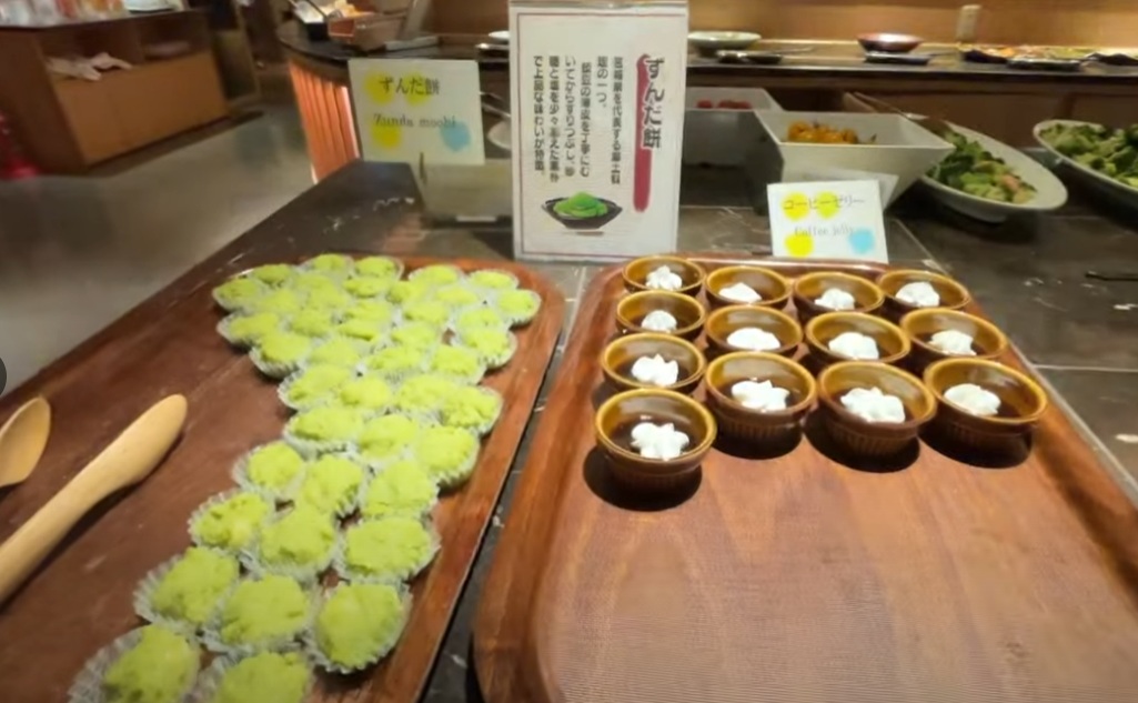 一般的なバイキング朝食とほぼ変わりないですが、ご当地の「笹かま」「ずんだもち」「牛タンカレー」などありました。
