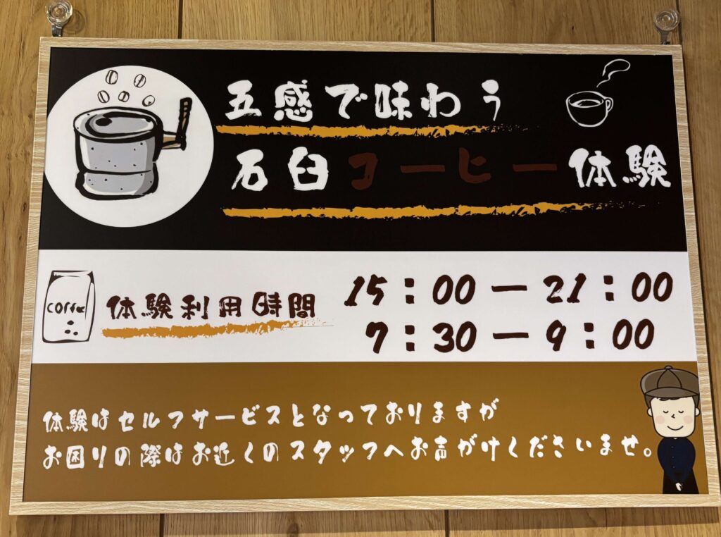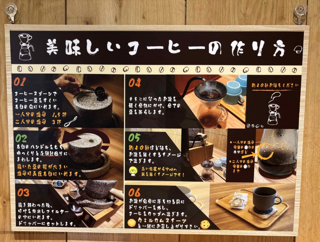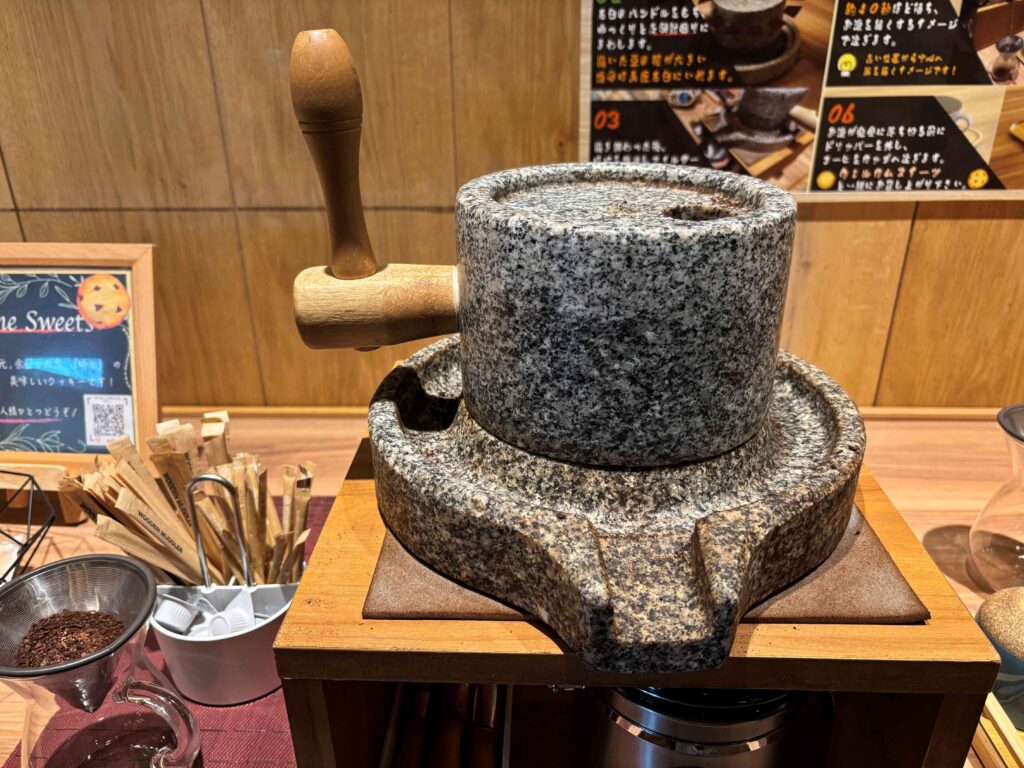 それに加えて、なんと、自分で石うすでコーヒー豆を挽いて入れたり、お茶バーなどの体験ができます。