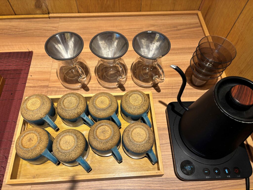 本格的な道具に素敵なコーヒーカップ。お湯の温度も調整できます。