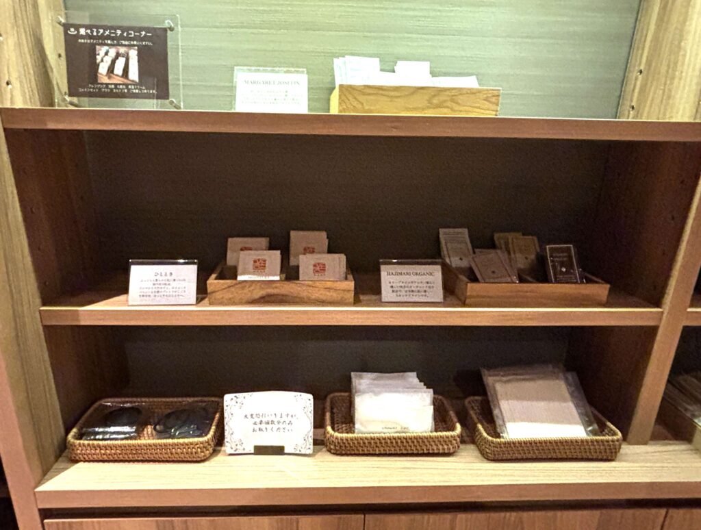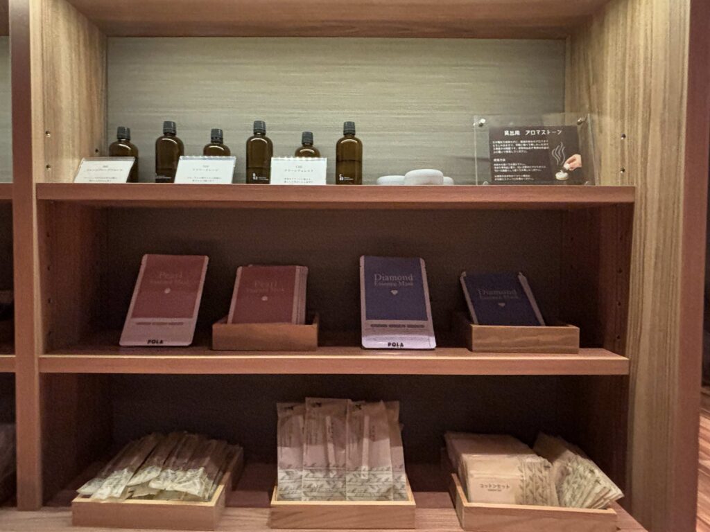 1階の温泉前に並べられた、好みのアメニティを必要な分だけ選んで持ってくるシステムです。