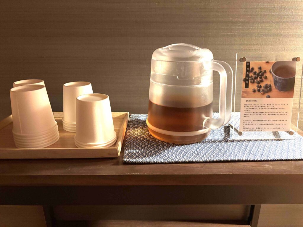 お風呂を出たところには、冷えた丹波黒豆茶が。