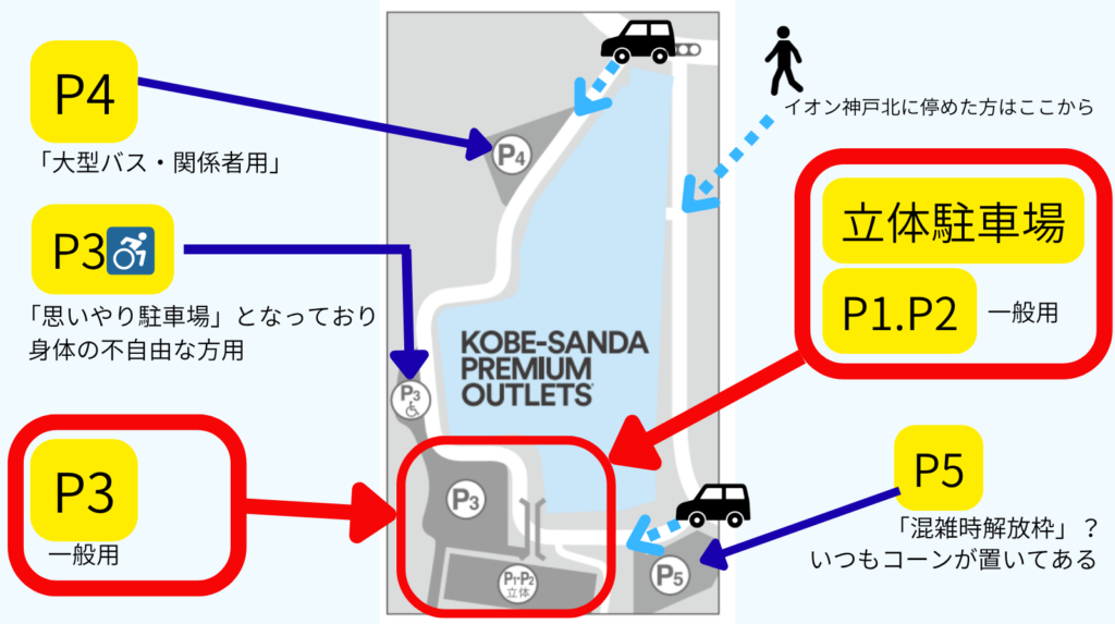 神戸三田プレミアムアウトレットの駐車場はP1からP5まであるので、初めて行く方はどの駐車場に停めたら効率的か…わかりませんよね。