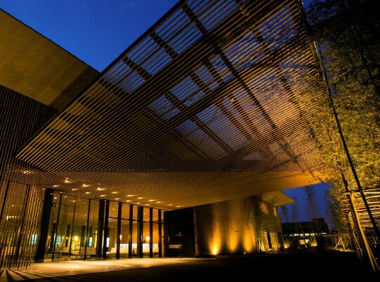竹林をテーマにした建築は、隈研吾建築都市設計事務所によるデザインで、自然と調和する質の高い静かな空間を生み出しています。