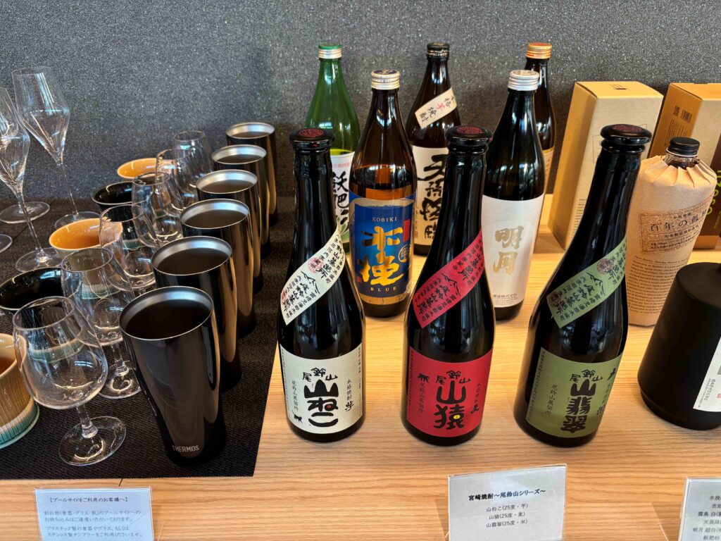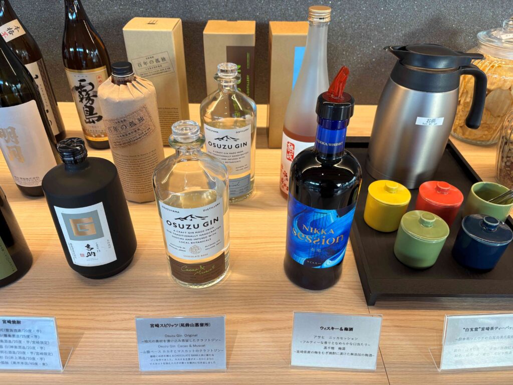 ウイスキーや梅酒もあり、お湯も用意されていて、お湯割りや、「白宝堂」の宮崎茶でのお茶割りも楽しめます。