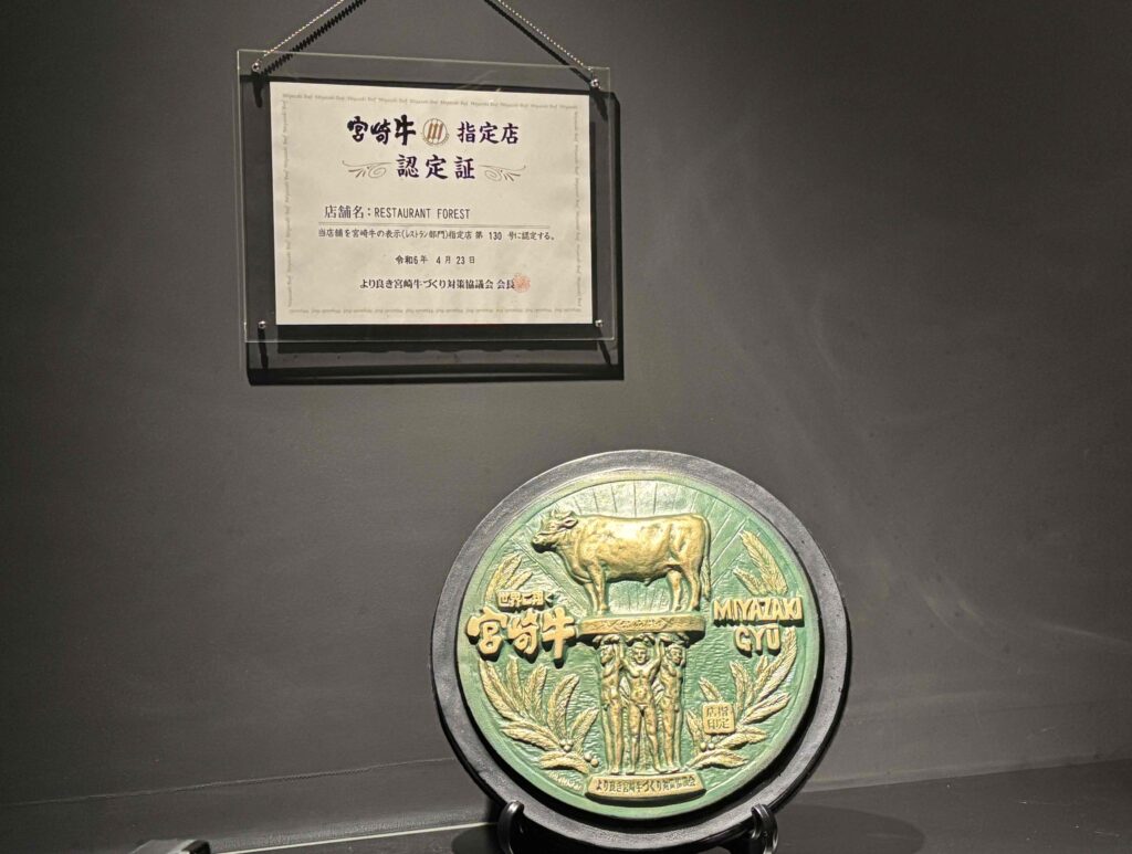 本物の宮崎牛を取り扱っている証のプレートが飾られています。